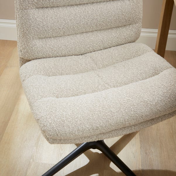 Height-adjustable swivel office chair with soft tonal boucle upholstery. Features a wide seat and stylish criss-cross back for ergonomic support. Adds comfort and elegance to any home or office workspace.