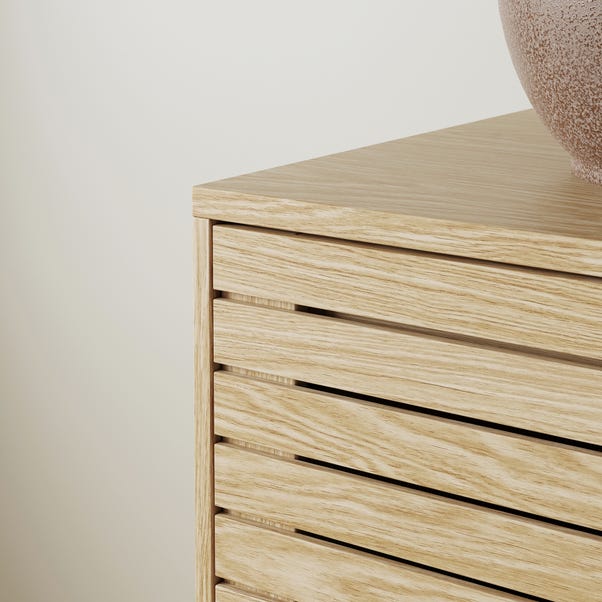 A modern wide sideboard featuring a clean slatted front and adjustable shelves for versatile storage. Built with cable management and easy assembly, it suits dining rooms, living areas, or home offices. Available in light oak or walnut effect, it combines style, functionality, and practicality.